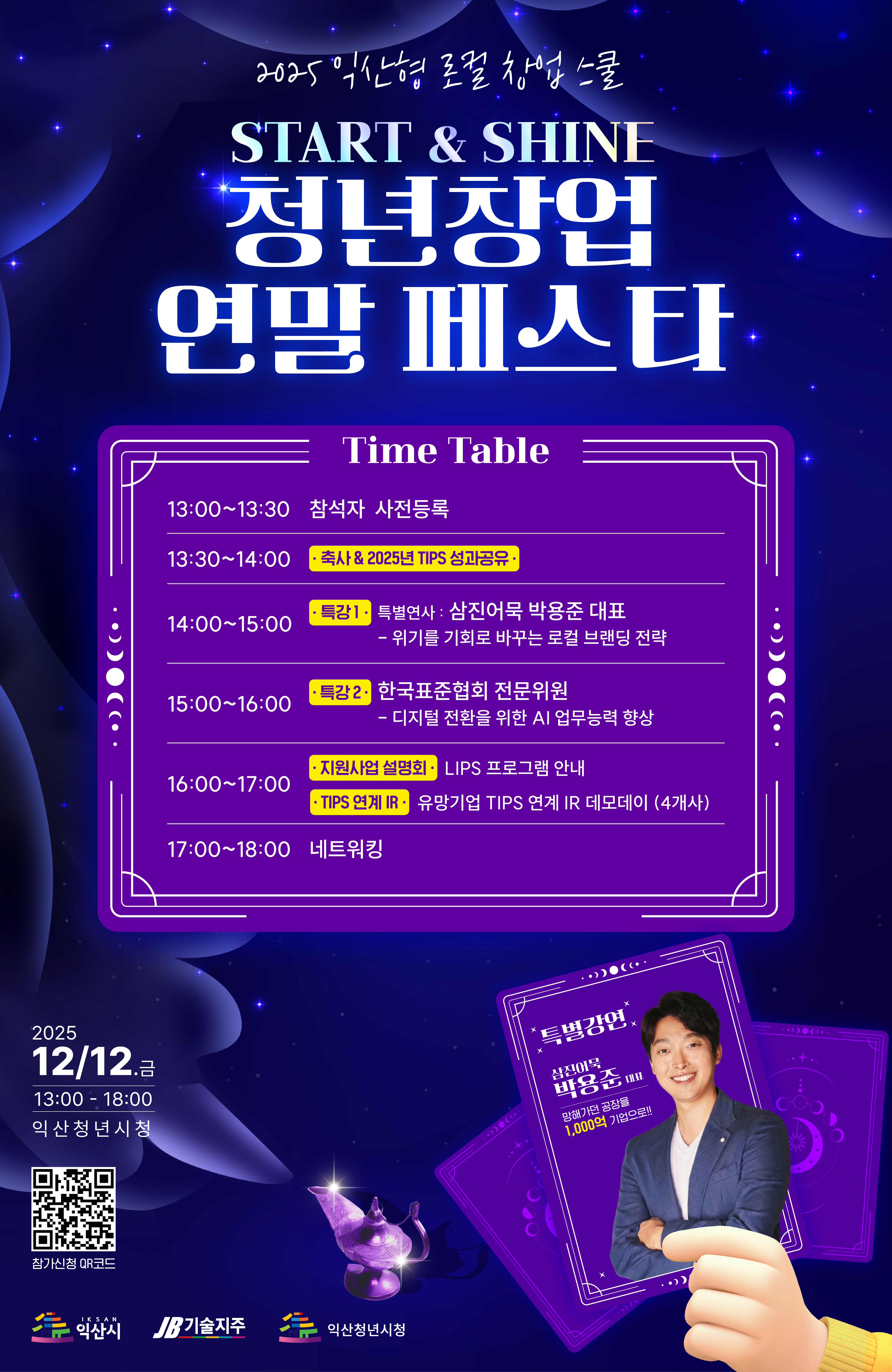 제목[JB기술지주] 2025년 청년창업 연말 페스타 『START&SHINE』참석자 모집 관리자 | 조회 32 | 2025-12-08 15:15 본문 내용<2025년 청년창업 연말 페스타 『START&SHINE』> * 일시/장소: 12. 12.(금), 13:30~18:00/익산청년시청 (주소: 익산시 중앙로22-202) * 참석대상: 창업과 투자에 관심있는 청년 (예비)창업기업 누구나 - 참석자 사전등록 필수! * 주요내용 - (특강) ①위기를 기회로 바꾸는 로컬 브랜딩 전략(특별연사: 삼진어묵 대표) / ②AI를 이용한 업무능력 향상 등 - (사업설명회) 2026년 창업지원 사업 설명회(LIPS 프로그램) - (IR 데모데이) TIPS 연계형 IR 데모데이 - (부대 이벤트) 기업 전시&홍보, 새해맞이 타로&사주, 캐리커처, 포토존 촬영 등